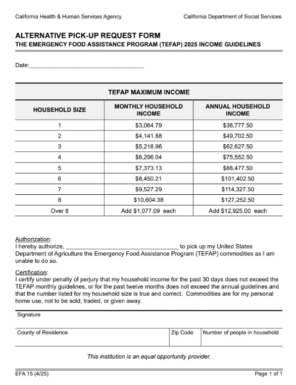 If you are picking up food for another family or person, please download the required alternate pick-up form above and fill out prior to EACH food pick-up. Please use the most current form, EFA 15 (4/25). Current forms will be available at each distribution.