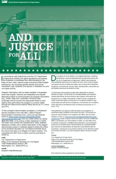" To file a program discrimination complaint, a complainant should complete a Form AD-3027, USDA Program Discrimination Complaint Form, which can be obtained online, at https://www.usda.gov/about-usda/general-information/staff-offices/office-assistant-secretary-civil-rights/how-file-program-discrimination-complaint, from any USDA office, by calling (866) 632-9992, or by writing a letter addressed to USDA. The letter must contain the complainant’s name, address, telephone number, and a written description of the alleged discriminatory action in sufficient detail to inform the Assistant Secretary for Civil Rights (ASCR) about the nature and date of an alleged civil rights violation. The completed AD-3027 form or letter must be submitted to USDA by: mail: U.S. Department of Agriculture Office of the Assistant Secretary for Civil Rights 1400 Independence Avenue, SW Washington, D.C. 20250-9410; or fax: (833) 256-1665 or (202) 690-7442; or email: program.intake@usda.gov. This institution is an equal opportunity provider. "